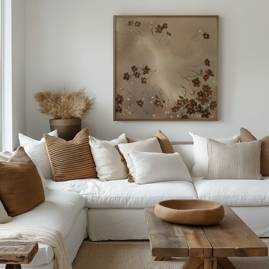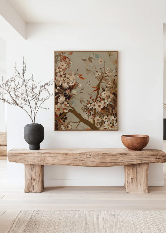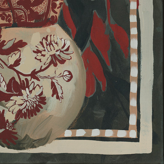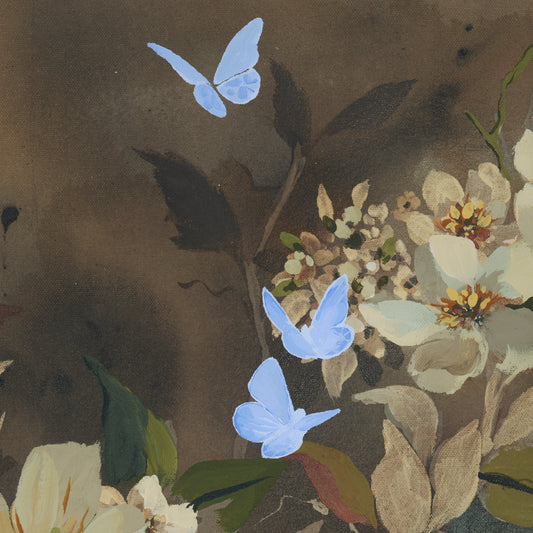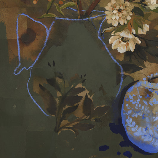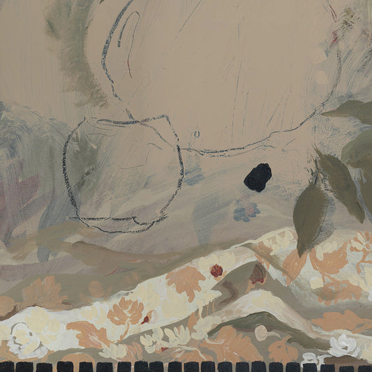 Using neutral washes of grounding earthy colours and intricate details—florals, fruits, patterns, landscapes—I embrace both the raw and the refined. Exposed underlayers speak to the process, reminding us that growth takes time, patience, and care.