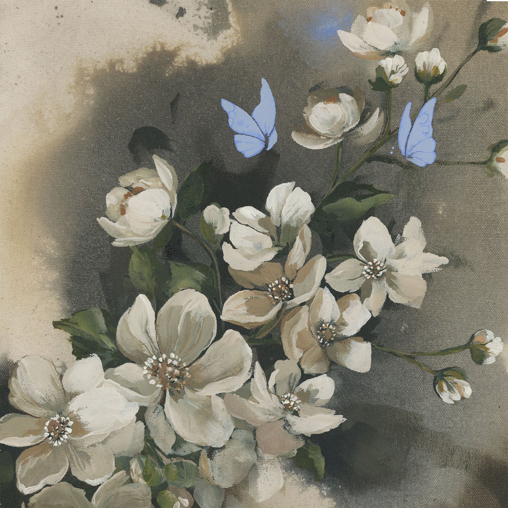 These artworks honor the tender transition from holding to releasing, from becoming to simply being. The soft florals represent grounded maturity, while the blue butterflies signal the arrival of openness, lightness, and renewal. Together, they portray a stage of flourishing that is not just personal, but shared.